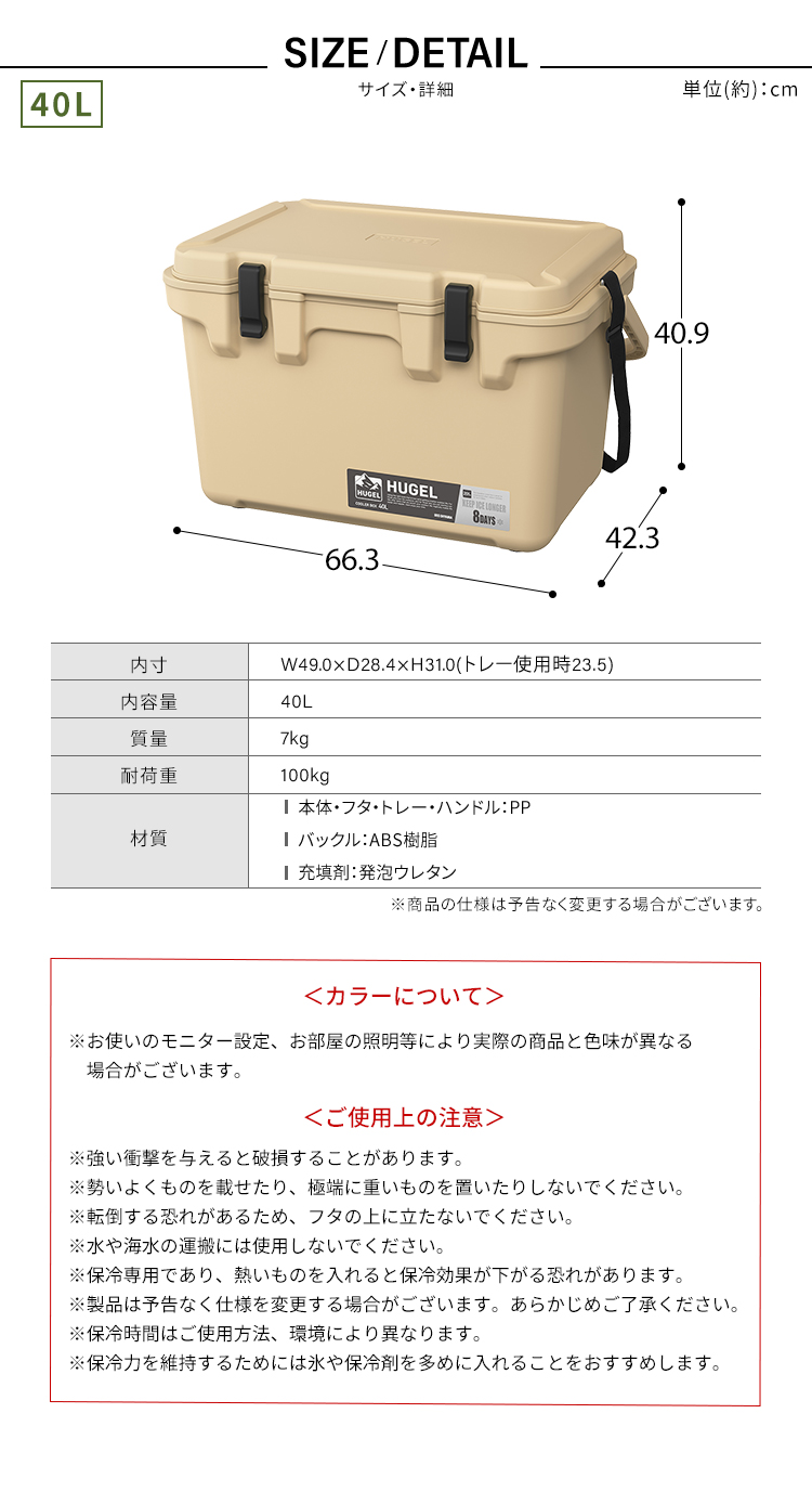 高密度発泡ウレタンを用いた、長時間高保冷効果のあるクーラーボックスです。断熱層(ウレタン層)をスリム化し、製品サイズと重量を削減し軽量化しました。