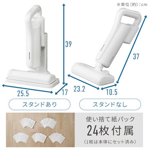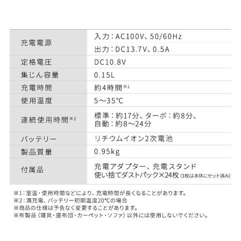 充電アダプター、充電スタンド、使い捨てダストパック×24枚(1枚は本体内にセット済み)