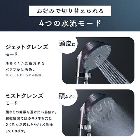 4つの水流モード[ミストクレンズ/バブルクレンズ/ストレート/ジェットクレンズ]を搭載しており、手元で簡単にお好みのモードに切り替えができます。