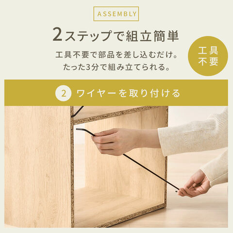 工具不要で、棚板とワイヤーを取り付けるだけで簡単に組み立てることができます。