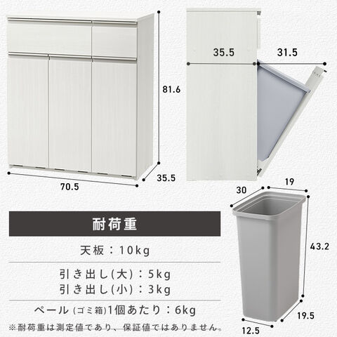 全体約36kg、天板約10kg、引き出し(小)約3kg、引き出し(大)約5kg、ペール1個あたり約6kg
