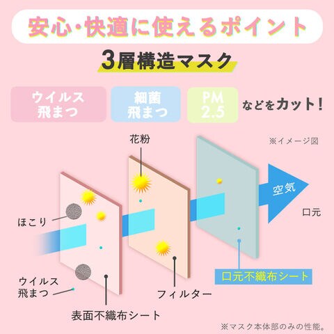 3層構造(表面不織布シート/フィルター/口元不織布シート)で、花粉・ウイルス飛沫・細菌飛沫・PM2.5などをカットします(※)。
