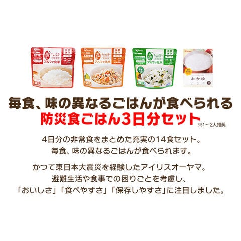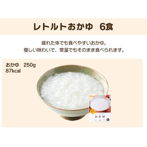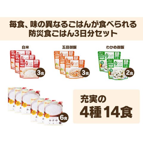 (アルファ化米飯(白米)100g×3食、アルファ化米飯(五目御飯)100g×3食、アルファ化米飯(わかめ御飯)100g×2食、米飯類(おかゆ)250g×6食)