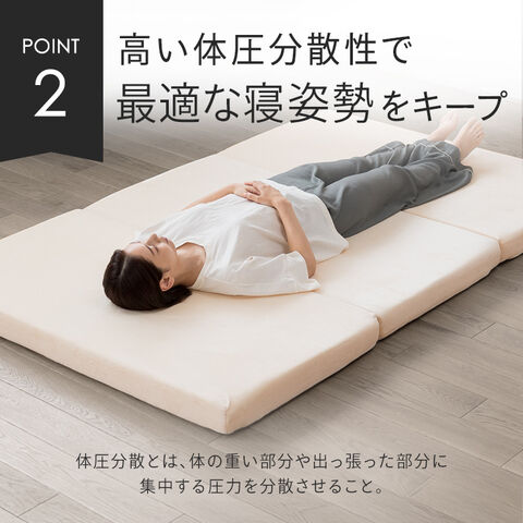 床付きを感じさせない、たっぷり約10cmの厚さなのでフローリングやベッドに直接敷いてお使いいただけます。