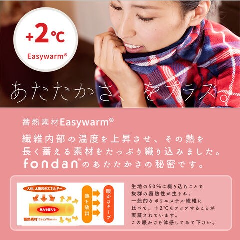 『イージーウォームTM』は人体と環境からのエネルギーを吸収し繊維内部の温度を上昇させ、その熱を長く保つ効果があります。