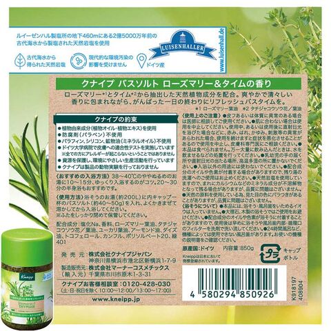 塩化Na、香料、ローズマリー葉油、タチジャコウソウ花/葉油、ユーカリ葉油、アーモンド油、ダイズ油、トコフェロール、カンフル、ポリソルベート20、緑401