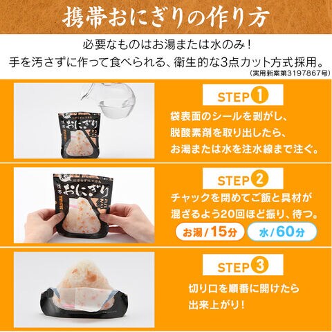 お湯または水を入れるだけで具材の旨味がギュッと詰まったおいしい三角形のおにぎりができあがります。