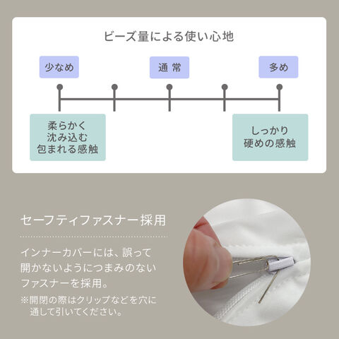 小さいビーズがたくさん入っているため、どんな形にも変形し、程よい弾力で、体全体を包み込むようなフィット感が特長です。