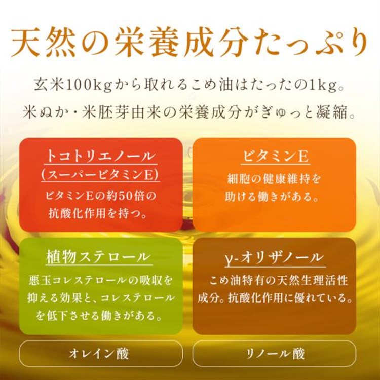 熱量126kcal、たんぱく質0g、脂質14g、コレステロール0mg、炭水化物0g、食塩相当量0g、ビタミンE5.8mg、オレイン酸6g、リノール酸5g、植物ステロール168mg、γ‐オリザノール30mg、トコトリエノール7.7mg