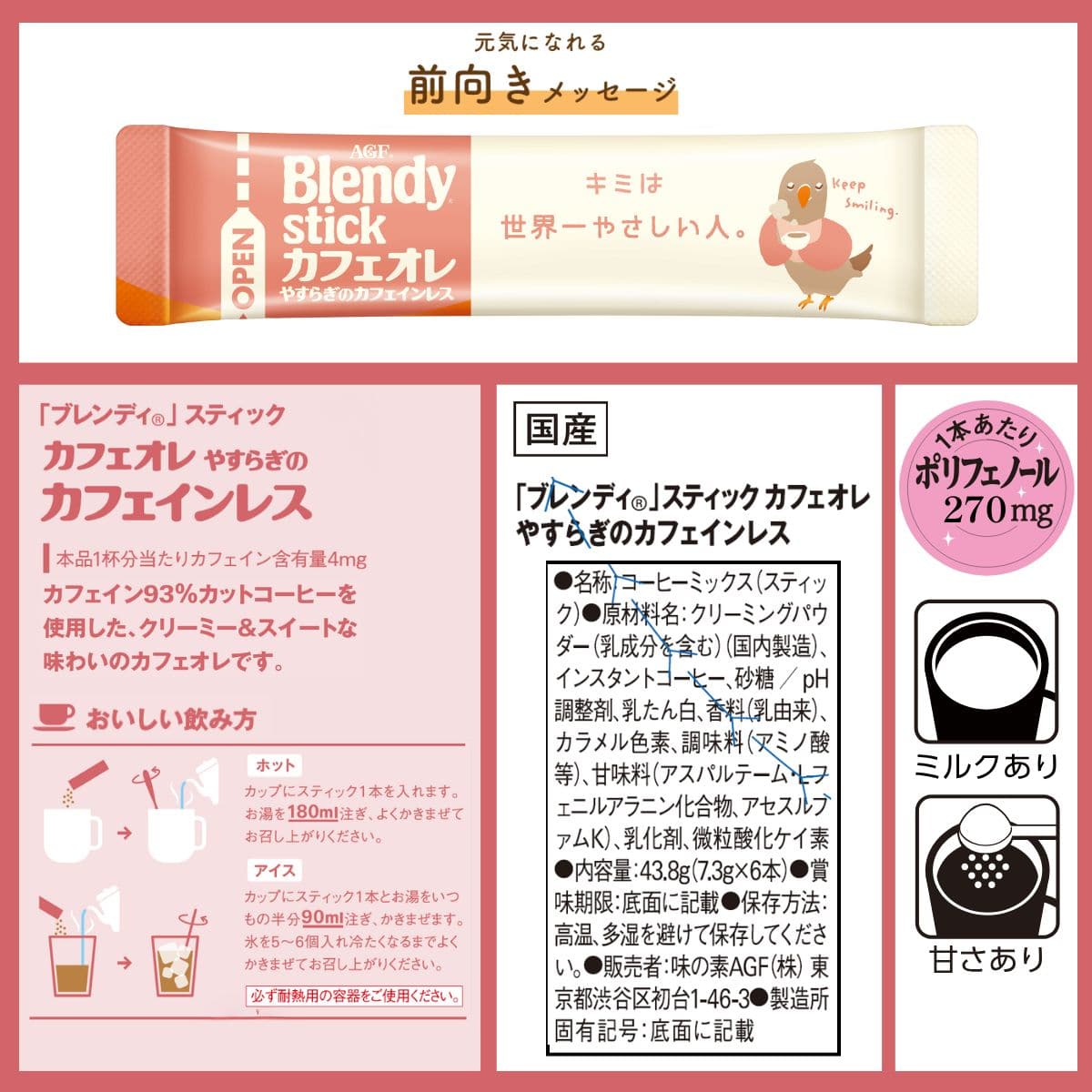 【安らぎカフェインレス】クリーミングパウダー(乳成分を含む)(国内製造)、インスタントコーヒー、砂糖 / pH調整剤、乳たん白、香料(乳由来)、カラメル色素、調味料(アミノ酸等)、甘味料(アスパルテーム・L-フェニルアラニン化合物、アセスルファムK)、乳化剤、微粒酸化ケイ素