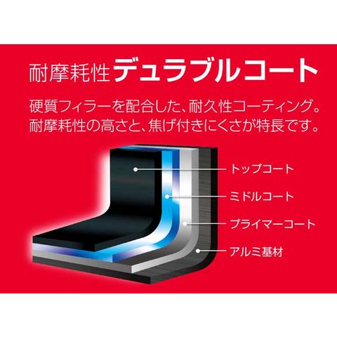 ○耐摩耗性デュラブルコート:耐久性が高く、焦げつきにくいのが特長です。蓄熱性に優れ、じっくりまんべんなく熱が広がるため焼きムラができにくい。