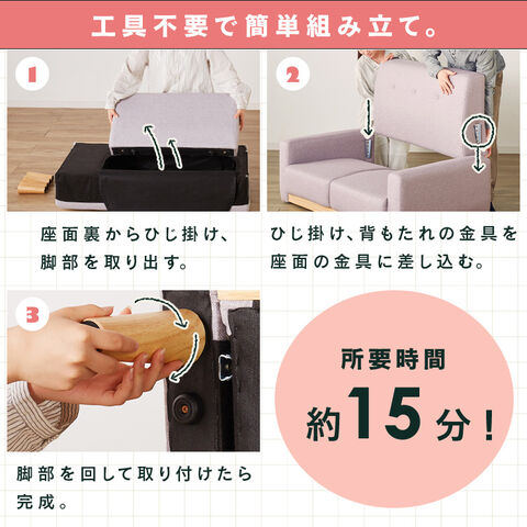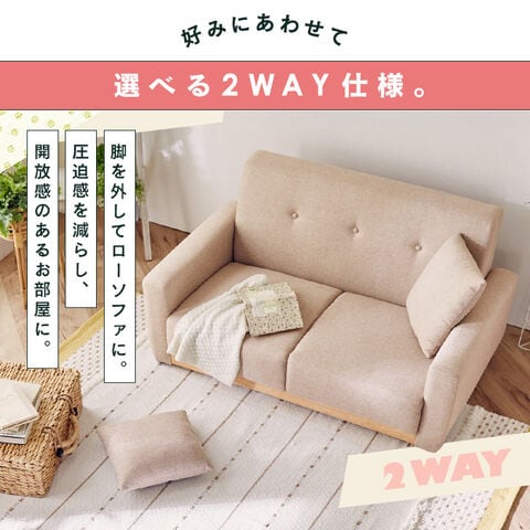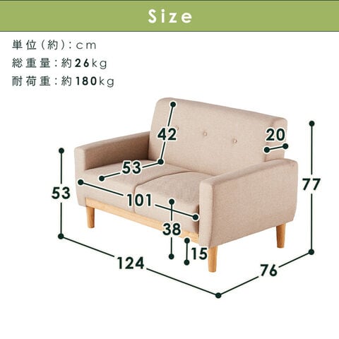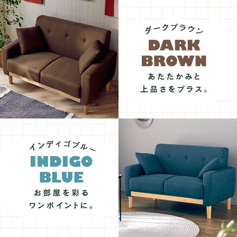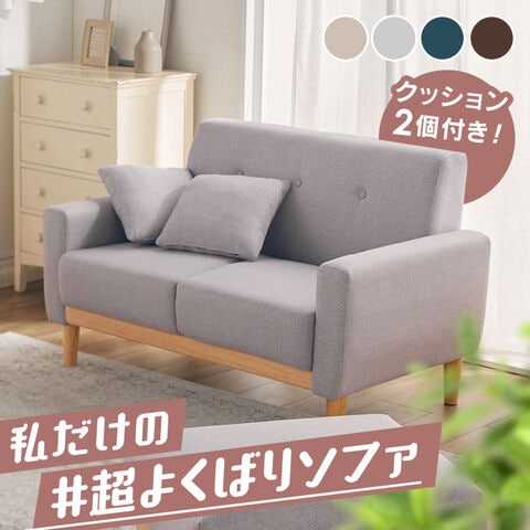クッション2個付きの北欧風デザインの2人掛けソファです。コンパクトサイズでワンルームにもぴったり。