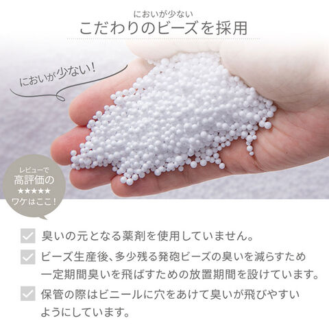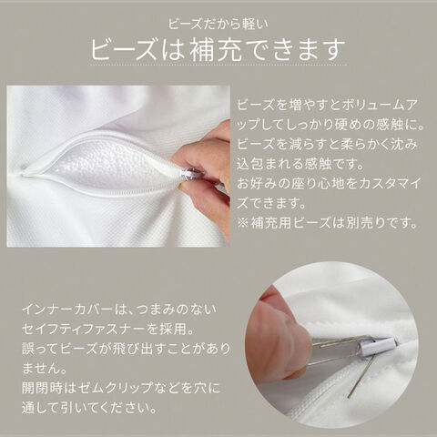 小さいビーズがたくさん入っているため、どんな形にも変形し、程よい弾力で、体全体を包み込むようなフィット感が特長です。