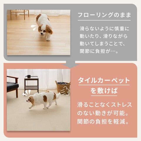フローリングでは慎重に歩くことで関節に負担がかかりやすいので、タイルカーペットでペットの体の負担を軽減。