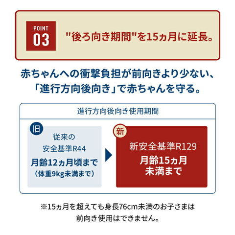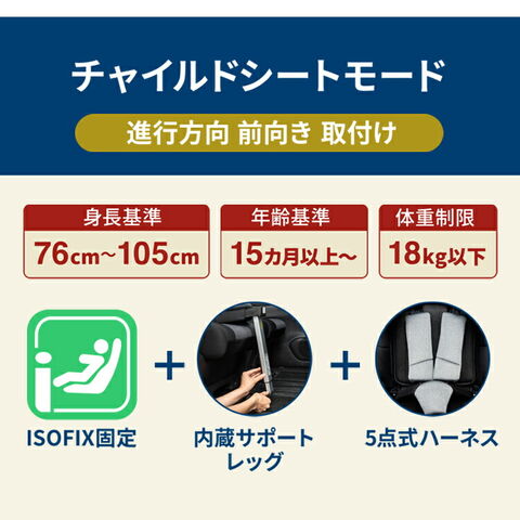 ISOFIX固定(月齢15ケ月まで且つ身長75cm以下は進行方向後向きにて使用)