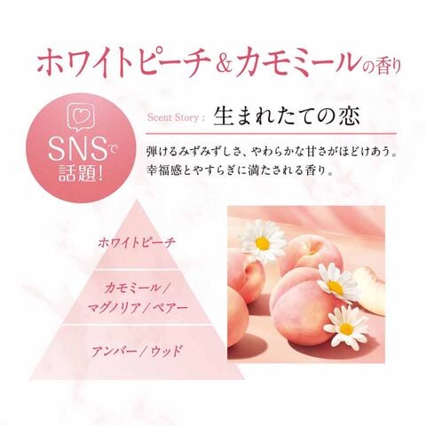 ・生まれたての恋 ホワイトピーチ&カモミールの香り:弾けるみずみずしさ、やわらかな甘さがほどけあう。幸福感とやすらぎに満たされる香り。