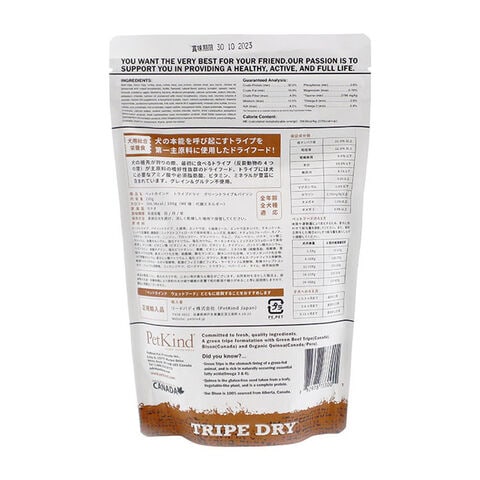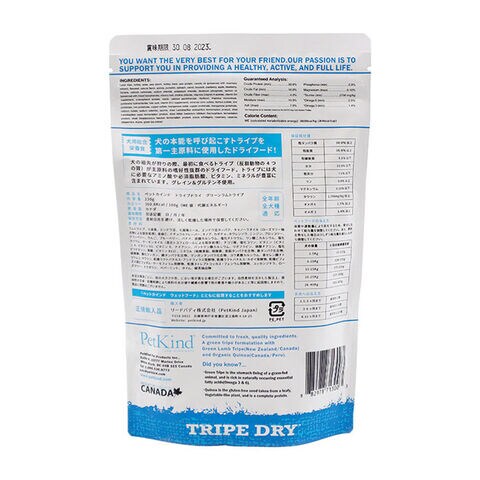ビーフトライプ、牛肉、鶏肉、エンドウ豆、チキンミール、七面鳥ミール、エンドウ豆澱粉、エンドウ豆タンパク、鶏脂肪(混合トコフェロールによる保存処理)、レンズ豆、亜麻仁、ナチュラルフレーバー、キノア、カボチャ、ホウレンソウ、ニンジン、ブロッコリー、クランベリー、りんご、ブルーベリー、バナナ、リン酸二カルシウム、炭酸カルシウム、塩化ナトリウム、塩化カリウム、、サーモンオイル(混合トコフェロールによる保存処理)、チコリ根、ビタミン(ビタミンA、ビタミン D3、ビタミンE、ナイアシン、パントテン酸カルシウム、リボフラビン、硝酸チアミン、塩化ピリドキシン、葉酸、ビタミン B12 )、ミネラル(硫酸亜鉛、硫酸鉄、亜鉛タンパク化合物、鉄タンパク化合物、硫酸銅、酸化マンガン、銅タンパク化合物、マンガンタンパク化合物、ヨウ素酸カルシウム、亜セレン酸ナトリウム)、塩化コリン、タウリン、乾燥ラクトバチルス・アシドフィラス発酵物、乾燥ラクトバチルス・カゼイ発酵物、乾燥ビフィズス菌ビフィダム・サーモフィラム発酵物、乾燥ストレプトコッカス・フェシウム発酵物、ユッカシジケラ、ローズマリー、トウガラシ、ペパーミント、タイム、緑茶抽出物