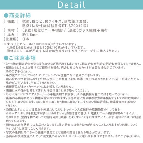 塩化ビニール樹脂(裏面ガラス繊維不織布)、付属品両面シール(4.5畳用・6畳用は6枚、8畳用・10畳用は10枚)