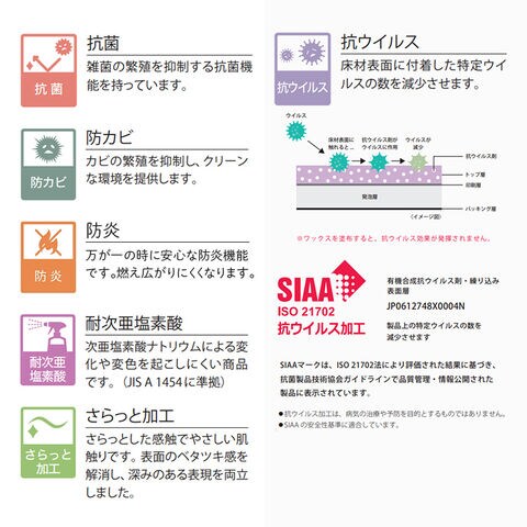 塩化ビニール樹脂(裏面ガラス繊維不織布)、付属品両面シール(4.5畳用・6畳用は6枚、8畳用・10畳用は10枚)