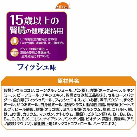 15歳以上の腎臓の健康維持用:タンパク質30.0%以上、脂質9.0%以上、粗繊維9.0%以下、粗灰分7.0%以下、水分10.0%以下