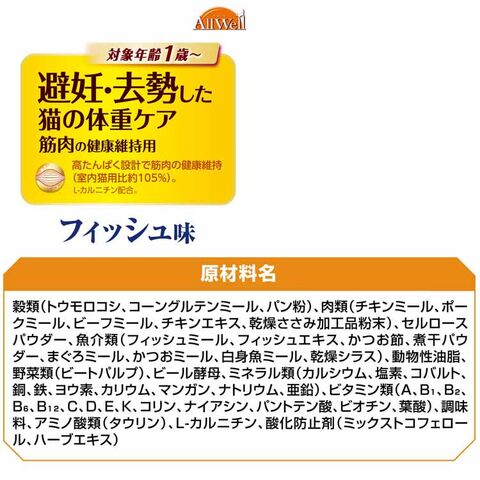避妊・去勢 フィッシュ味:タンパク質32.0%以上、脂質9.0%以上、粗繊維9.0%以下、粗灰分7.0%以下、水分10.0%以下