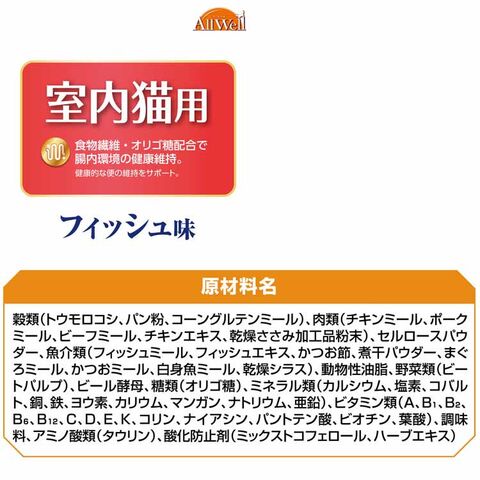 室内猫用 フィッシュ味:タンパク質30.0%以上、脂質9.0%以上、粗繊維9.0%以下、粗灰分7.0%以下、水分10.0%以下