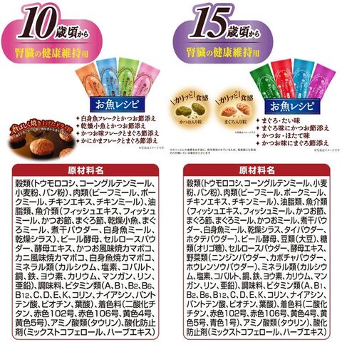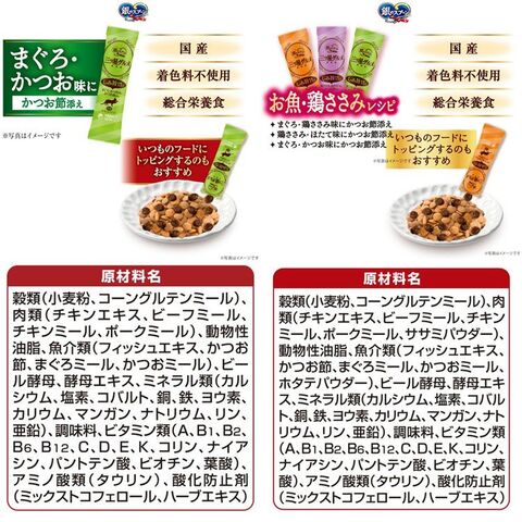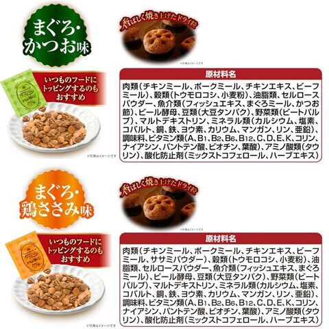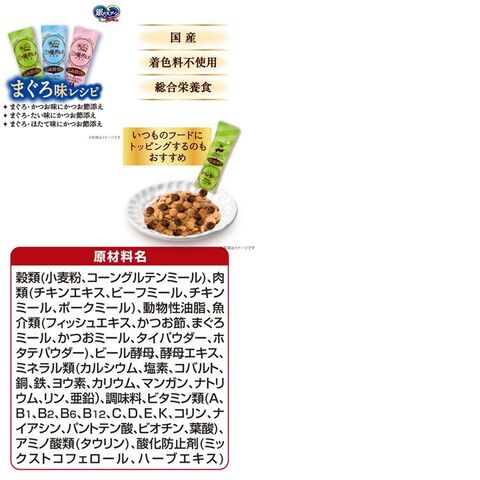 まぐろ・たい味にかつお節添え:タンパク質30.0%以上、脂質16.0%以上、粗繊維3.0%以下、粗灰分7.0%以下、水分10.0%以下/約395kcal