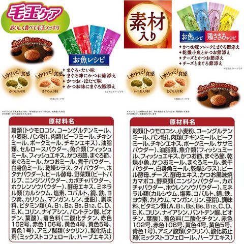 毛玉ケア:タンパク質30.0%以上、脂質19.0%以上、粗繊維9.0%以下、粗灰分7.0%以下、水分10.0%以下/約390kcal