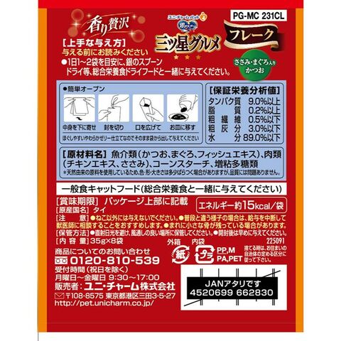 魚介類(かつお、まぐろ)、ささみ、酵母エキス、コーンスターチ、増粘多糖類