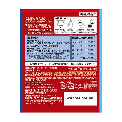 魚介類(かつお、まぐろ、フィッシュエキス)、チキンエキス、コーンスターチ、増粘多糖類、ミネラル類(Cl、K)、ビタミン類(B1、B2、B6、B12、E)