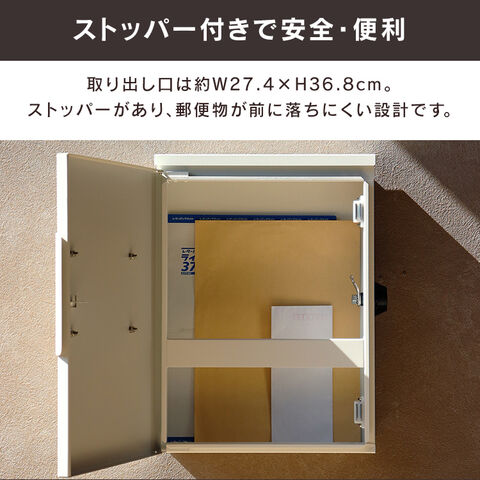 ・ストッパー付き:取り出し口内部にストッパーがついているため、郵便物が前に落ちにくい設計になっております。