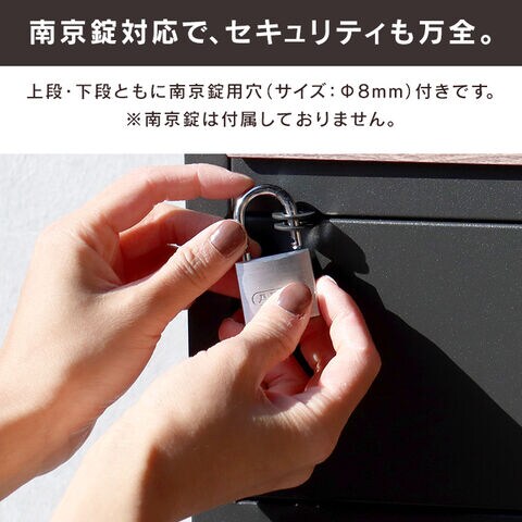 ・セキュリティ:上段、下段ともに、南京錠用穴があり、南京錠をご用意いただけましたら、扉の施錠が可能です(穴サイズ:Φ8mm)。