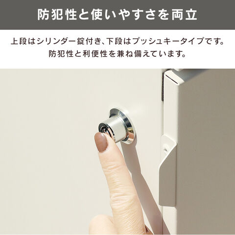 ・セキュリティ:下段は、プッシュキータイプで、簡単に鍵の開閉が可能で、防犯面にも安心です。また、スペアキーが1本付属しております。