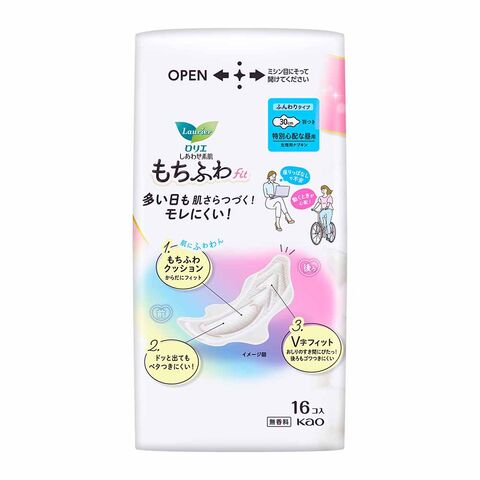 お徳な大容量タイプ。新感覚!もちふわクッションとV字フィットがすき間にぴたっ もちふわfit 多い日でも肌さらつづく、モレにくい!