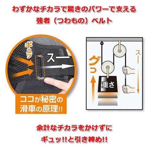 ベルト本体に装着された滑車を利用したテコの原理で、丸まった腰もわずかな力で驚きのパワーでギュッと引き上げて支える強者(つわもの)ベルト。