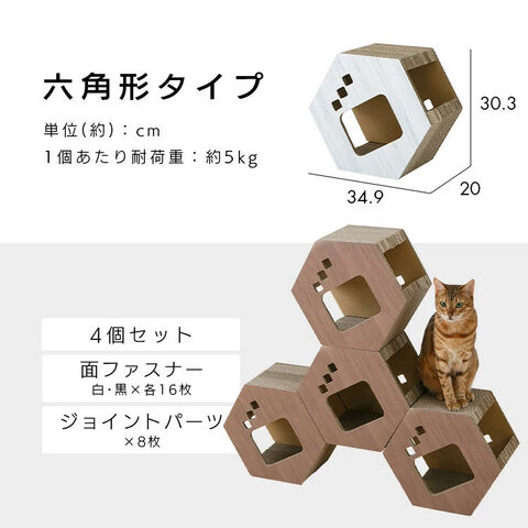 ダンボール製六角つめとぎ 木目(連結可能)猫の爪とぎ ストレス発散 猫喜ぶ 猫遊ぶ 猫くつろぐ 4コセット Hexagon 組み合わせ トンネル シンプル インテリア ブラウン