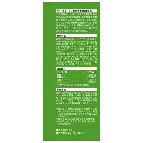 穀類(とうもろこし、とうもろこしたんぱく、小麦、米等)、肉類(チキンミール等)、動物性油脂、魚介類(まぐろ、かつお、小魚)、たんぱく加水分解物、フレーバーブレンド(鯛、サーモン、かに、サーディン、えび等)、ミネラル類(カルシウム、リン、カリウム、ナトリウム、クロライド、鉄、銅、マンガン、亜鉛、ヨウ素、セレン)、ビタミン類(A、E、K、B1、B2、パントテン酸、ナイアシン、B6、葉酸、ビオチン、B12、コリン)、アミノ酸類(メチオニン、タウリン)、着色料(カラメル色素、カロテノイド色素)