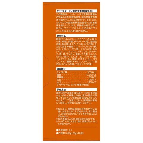穀類(とうもろこし、とうもろこしたんぱく、小麦、米等)、肉類(チキンミール等)、動物性油脂、魚介類(まぐろ、かつお、かつお節)、たんぱく加水分解物、フレーバーブレンド(鯛、かに、えび、サーモン等)、ミネラル類(カルシウム、リン、カリウム、ナトリウム、クロライド、鉄、銅、マンガン、亜鉛、ヨウ素、セレン)、ビタミン類(A、E、K、B1、B2、パントテン酸、ナイアシン、B6、葉酸、ビオチン、B12、コリン)、アミノ酸類(メチオニン、タウリン)、着色料(カラメル色素、カロテノイド色素)