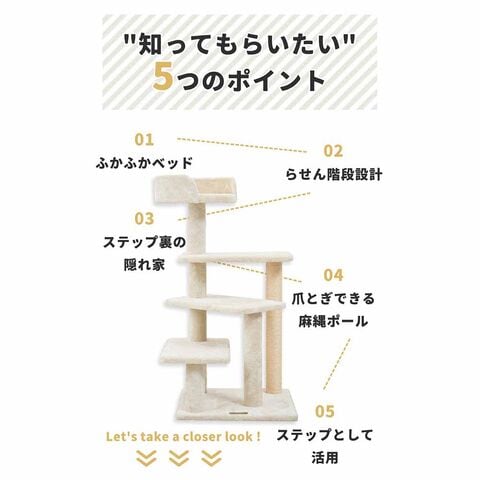 台座・ステップ台:木質ボードに生地貼り、ベッド:木質ボードに生地貼り・ポリエステル、ポール:紙管に麻縄巻き・生地貼り、接着剤:日本・ヨーロッパのホルムアルデヒド対策の程度を表す基準において、等級1をクリアしています。