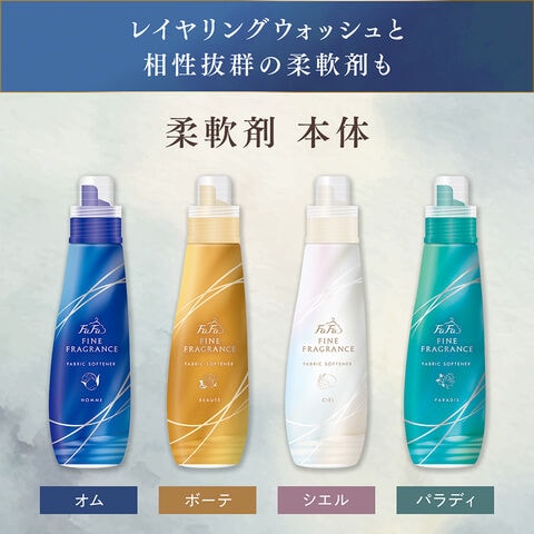 ●洗剤と柔軟剤の香りを重ねて(レイヤリング)、もっと印象華やかに●天然香料配合●48時間抗菌●蛍光剤・漂白剤無配合●すすぎ1回・自動投入OK●透明感あるクラッシーソープの香り