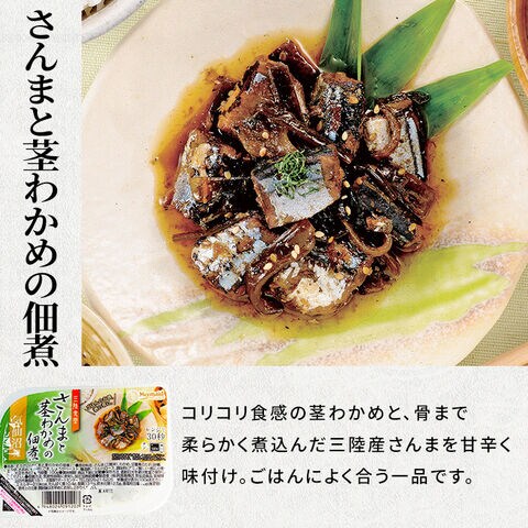 原材料:さんま、わかめ、白ごま(ごま)、砂糖、しょうゆ、水あめ、みりん、昆布エキス、生姜、醸造酢/トレハロース、調味料(アミノ酸)、(一部に大豆・小麦を含む)