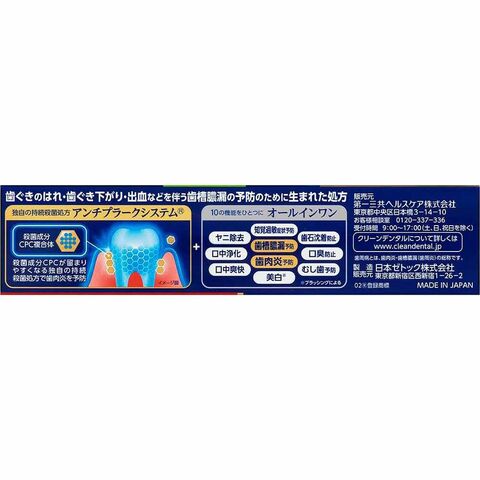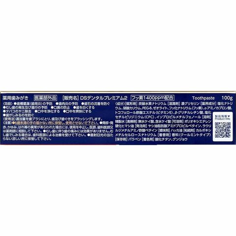 薬用成分:塩化ナトリウム、硝酸カリウム、PEG-8、ゼオライト、フッ化ナトリウム(フッ素)、ε-アミノカプロン酸、トコフェロール酢酸エステル(ビタミンE)、β-グリチルレチン酸、塩化セチルピリジニウム(CPC)、イソプロピルメチルフェノール