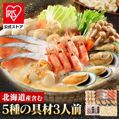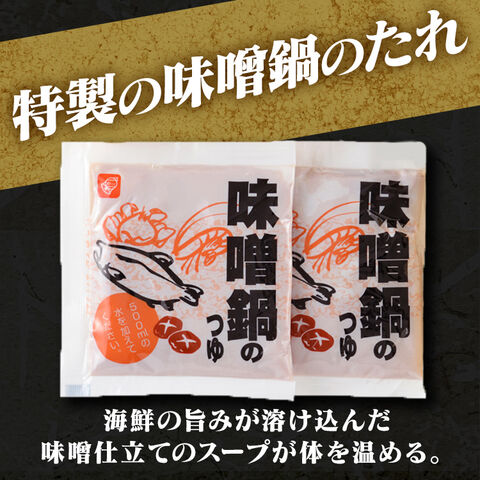 うどん(小麦粉、食塩)、しろさけ、パーナ貝、ボイル帆立、ボイル甘えび、かに入りつみれ(魚肉すり身、豚脂、でん粉、種もの(かに風味蒲鉾、玉ねぎ、かに正肉)、粒状大豆たん白、卵、魚介エキス、砂糖、食塩、本みりん)、えび入りつみれ(魚肉すりみ、豚脂、種もの(おきあみ、玉ねぎ、えび、ねぎ)、でん粉、粒状大豆たん白、卵、砂糖、食塩、魚介エキス、本みりん)、とりごぼうつみれ(鶏肉、魚肉すり身、種もの(玉ねぎ、人参、ごぼう、生姜)、パン粉、卵、粒状大豆たん白、砂糖、小麦粉、食塩、発酵調味料、魚介エキス、白味噌、蛋白加水分解物)、味噌鍋タレ(みそ、食塩、ごま、砂糖、小麦粉、ポークエキス、ビーフエキス、チキンエキス、酵母エキス/加工澱粉、調味料(アミノ酸等)、増粘剤(加工澱粉、キサンタン)、酒精、紅麹色素