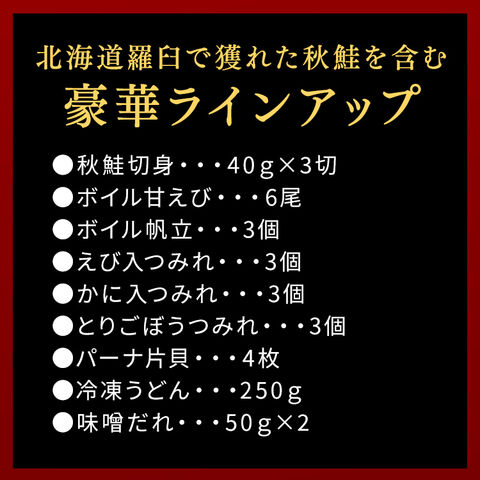 秋鮭切身40g×3切、ボイル甘えび6尾、ボイル帆立3個、えび入つみれ3個、かに入つみれ3個、とりごぼうつみれ3個、パーナ片貝4枚、冷凍うどん250g、味噌だれ50g×2