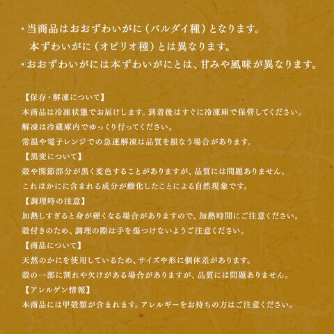 オオズワイガニ(北海道産)、かにみそ、還元水飴、食塩、かにエキス、植物蛋白加水分解物/微結晶セルロース、調味料(有機酸等)、増粘剤(加工澱粉)、香料、(一部にかに・小麦・大豆を含む)
