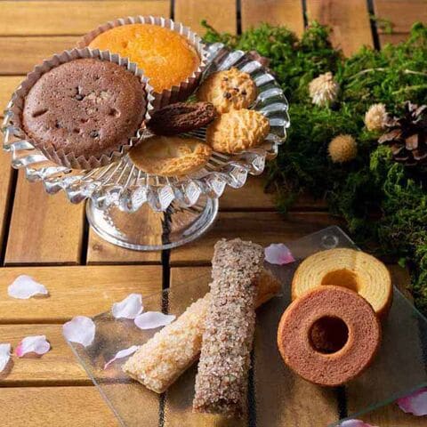 美しい森の中で、色とりどりの花たちと鳥たちがさえずる、森の詩のお菓子。切り株のしっとりバーム、森の枝のさくさくパイなど、