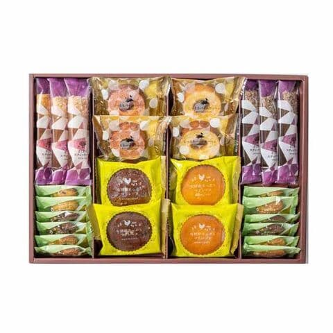 しっとりバームクーヘン・しっとりバームクーヘン苺×各2、有精卵たっぷりマドレーヌ(プレーン・ショコラ×各2)、香ばしくて素朴なクッキー(ミルク・ショコラ×各4、チョコチップ・メープル×各2)、さくさくスティックパイ(メープル・ショコラ×各3) 合計26個