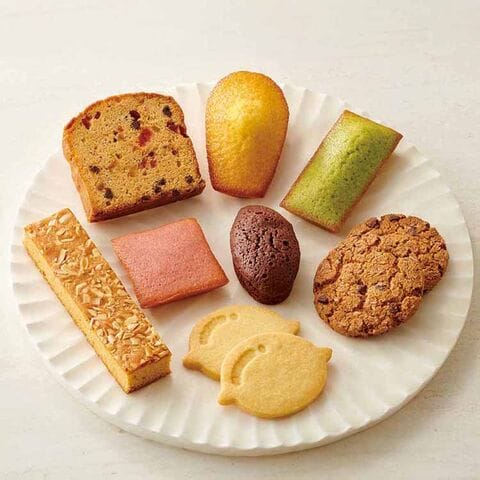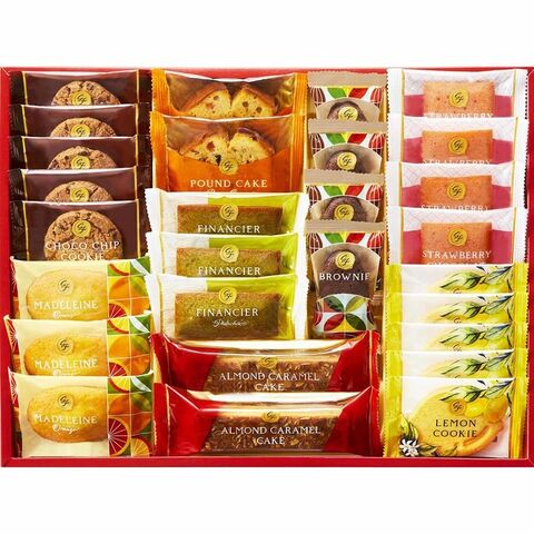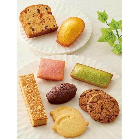 オレンジマドレーヌ×3個、ストロベリーショコラケーキ×4個、ピスタチオフィナンシェ×3個、ブラウニー×4個、ブラウンシュガーパウンドケーキ×2個、アーモンドキャラメルケーキ×2個、チョコチップクッキー×5個、レモンクッキー×5個