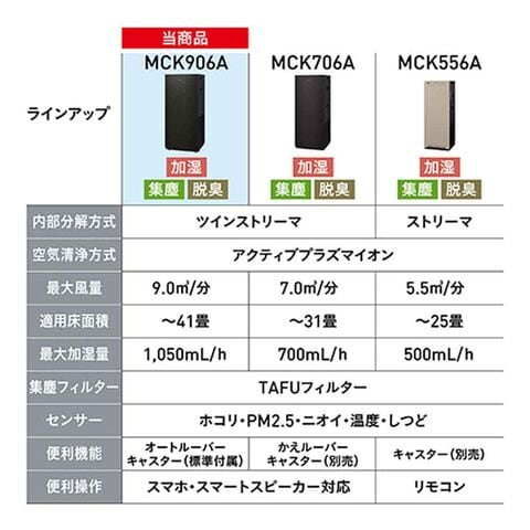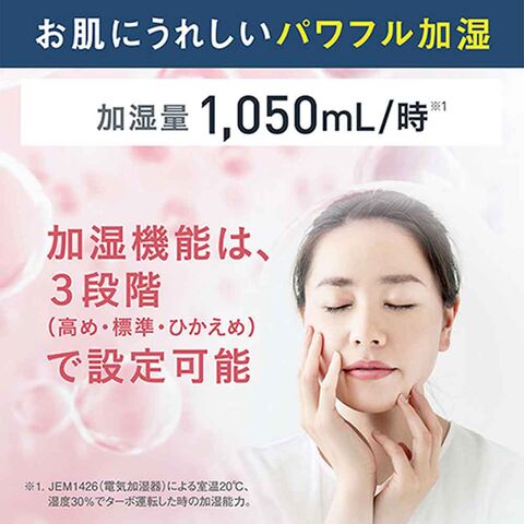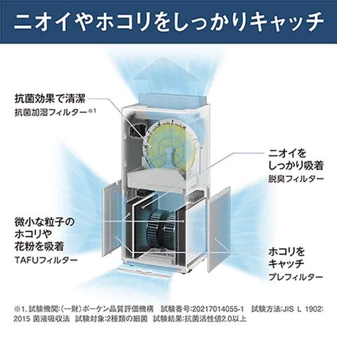 加湿機能は3段階で設定可能、抗菌加湿フィルターや水トレイに銀イオン抗菌剤搭載の清潔加湿。