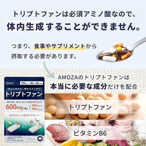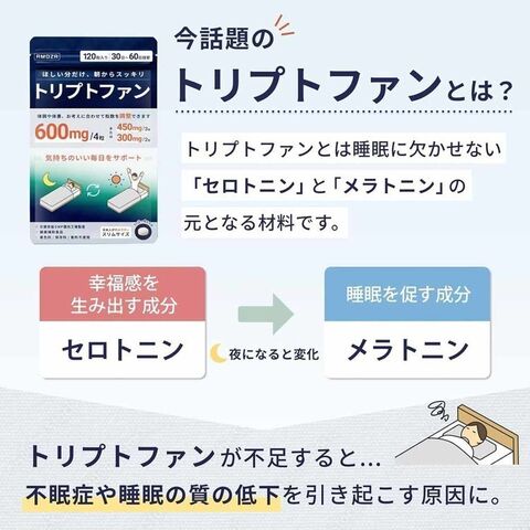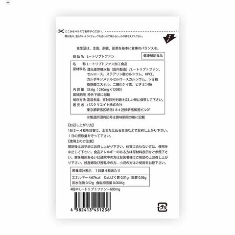 L-トリプトファン、セルロース、ステアリン酸カルシウム、HPCL、カルボキシメチルセルロースカルシウム、ショ糖脂肪酸エステル、二酸化ケイ素、ビタミンB6